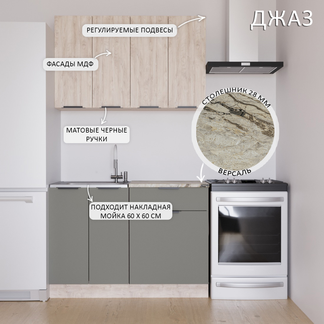Кухонный гарнитур "Джаз" – прекрасный выбор для обустройства вашей кухни. Элегантное сочетание оттенков придает гарнитуру современный и стильный облик, преображая пространство.