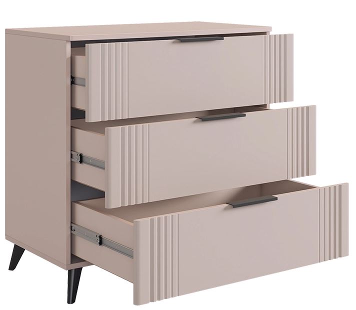 • Стильные металлические ручки: Удобно лежат в руке и дополняют образ комода.