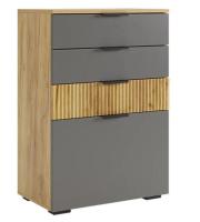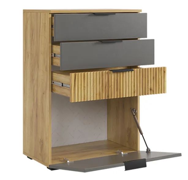 Комод "Бери" - модный и стильный предмет мебели, который представляет собой функциональное и практичное решение для разных помещений. Состоящий из трех вместительных ящиков и нижней откидной барной секции, комод "Бери" отличается компактными размерами (350 мм глубины), при этом обладая достаточным объемом для хранения различных предметов. Комод может быть удачным дополнением для гостиной, спальни, прихожей, детской комнаты или кабинета. Особым акцентом комода является фасад ящика из МДФ с вертикальной фрезеровкой "Вельвет".