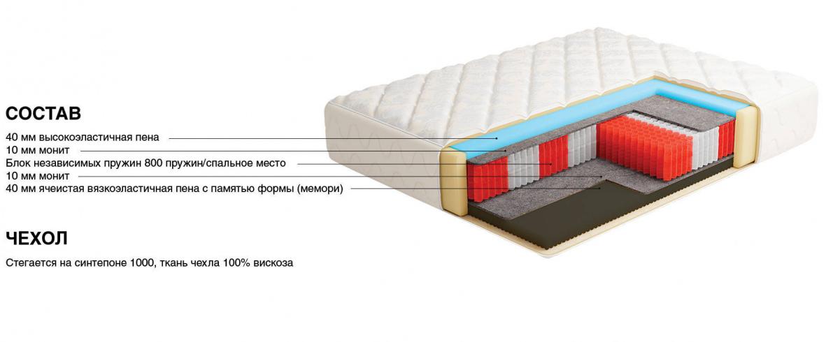 Высокий уровень комфорта матрас обеспечивает за счет блока независимых пружин - 800 штук на одно спальное место, благодаря этому матрас с легкостью подстраивается под форму спящего и может выдержать достаточно высокие нагрузки (до 130 кг/ спальное место).